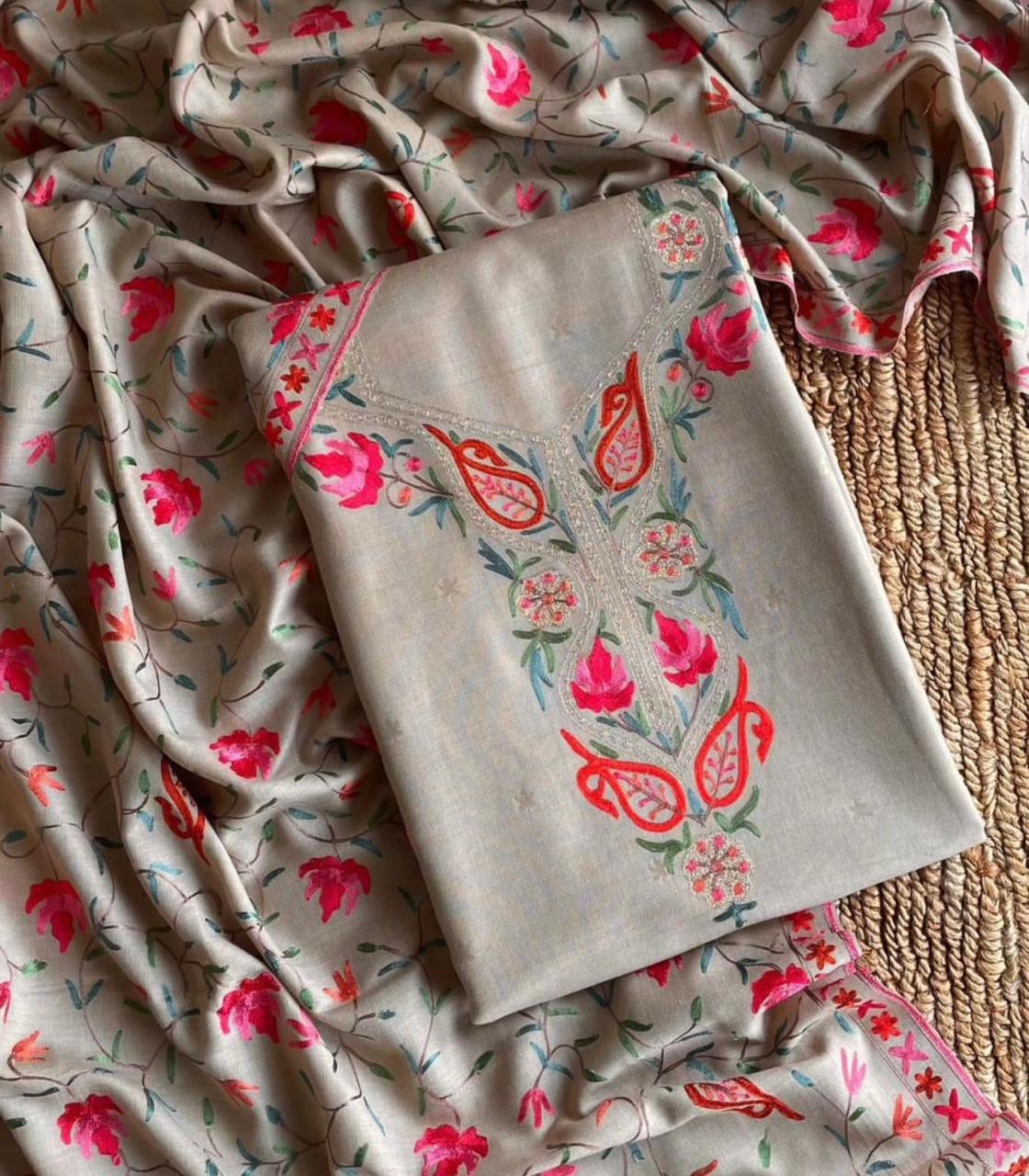 Bring home a beautiful kashmiri aari work suit for yourself or your family members& light up yourself. It has exquisite embroidery in geometric motifs using aari threads.